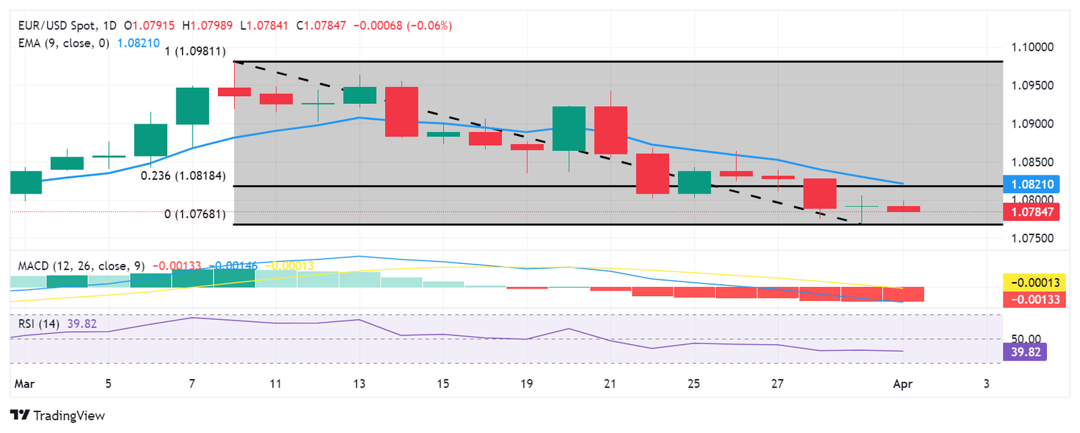EUR/USD Price Analysis: Maintains position below the psychological level of 1.0800