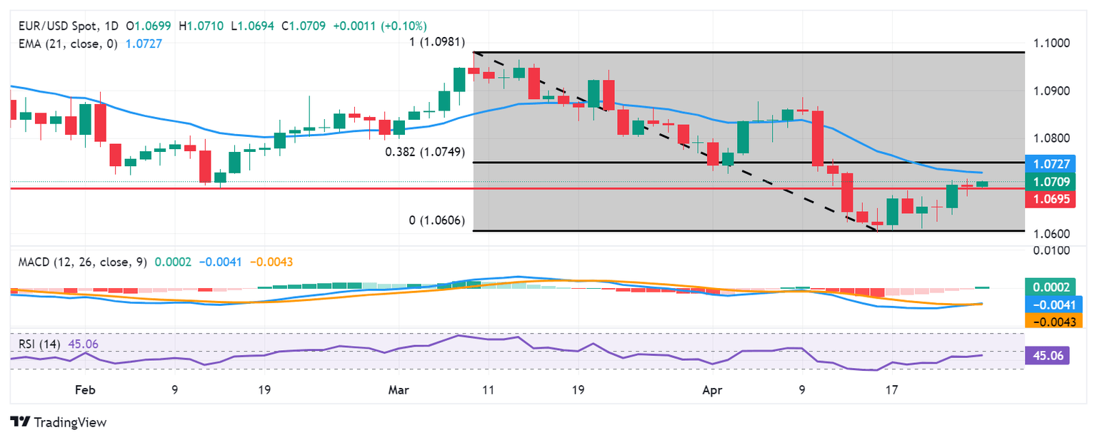 EUR/USD recovers its recent losses registered in the previous session, trading around 1.0710 during the Asian session on Thursday. From a technical standpoint, analysis suggests a weakening of bearish sentiment for the pair as it has surpassed the major level of 1.0695 and the psychological level of 1.0700.