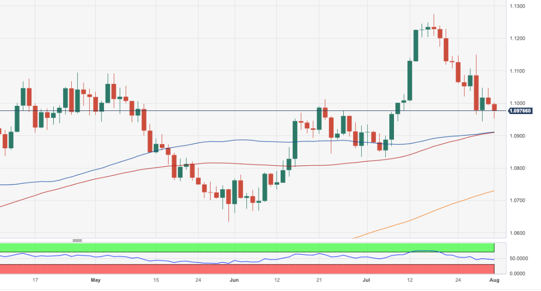 Considering the ongoing price action, spot could see its selling pressure accelerate and retest the weekly low of 1.0943 (July 28). The breakdown of this region could put a test of the 1.0910 zone, where the transitory 55-day and 100-day SMAs coincide, back on the radar.