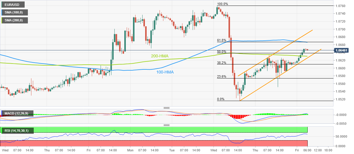 EUR/USD picks up bids to renew intraday top around 1.0650 as it portrays a two-day uptrend during the early hours of Friday. In doing so, the major currency pair cheers the upside break of the 200-Hour Moving Average (HMA) within a two-day-old ascending trend channel.