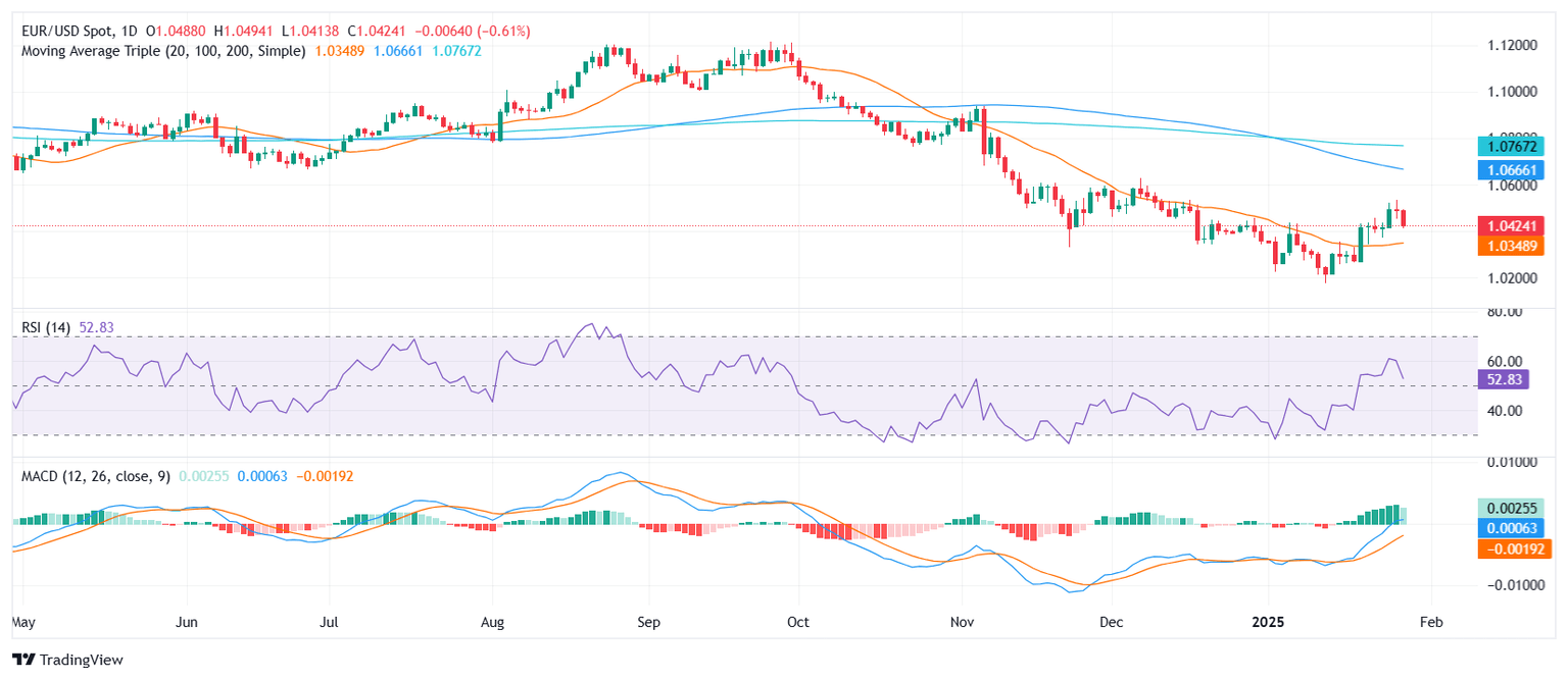 The EUR/USD pair experienced a notable decline on Tuesday, slipping by 0.57% to settle at 1.0430. Despite holding within a relatively tight range in recent sessions, the pair’s inability to sustain upward traction signals waning bullish momentum and raises the likelihood of further downside in the near term.