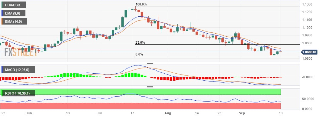 On the upside, the EUR/USD pair could face a barrier around the 1.0700 psychological level, lined up with the nine-day Exponential Moving Average (EMA) at 1.0705.