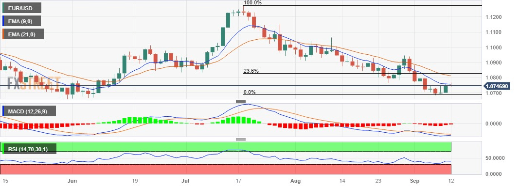 On the upside, a significant resistance level for the EUR/USD pair is represented by the nine-day Exponential Moving Average (EMA) at 1.0756, following the 1.0800 psychological level.