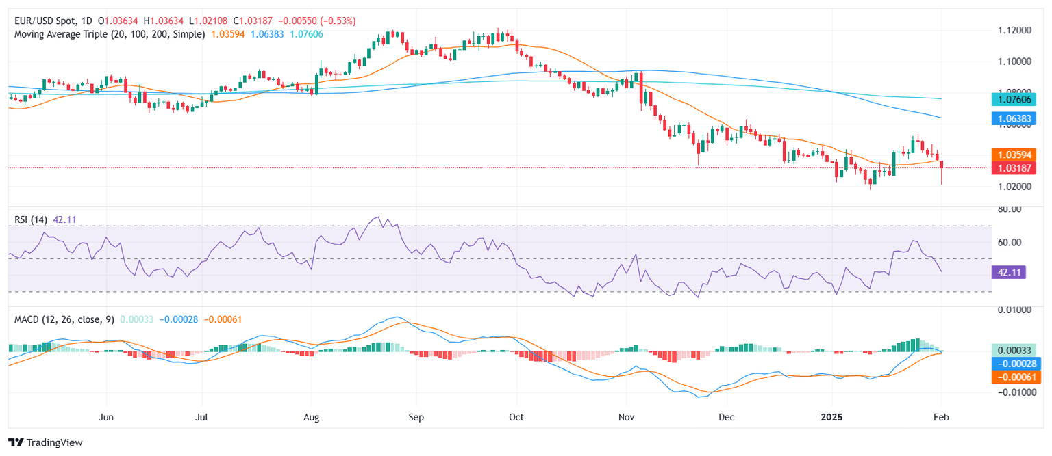 The EUR/USD pair continued its downward trajectory on Monday, slipping to a low around 1.0200 before staging a brief rebound to 1.0300. However, the failed attempt to extend gains highlights the prevailing selling pressure, keeping the pair below its 20-day Simple Moving Average (SMA) and maintaining a bearish outlook.
