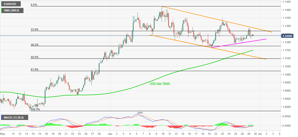 EUR/USD declines to 1.1240 during the initial hour of Tokyo open on Tuesday. The pair earlier stretched pullback moves from 1.1220 till 1.1252. Even so, the quote portrays a short-term bullish flash on the four-hour chart while looking at its rise from mid-May and gradual weakness after June 10.
