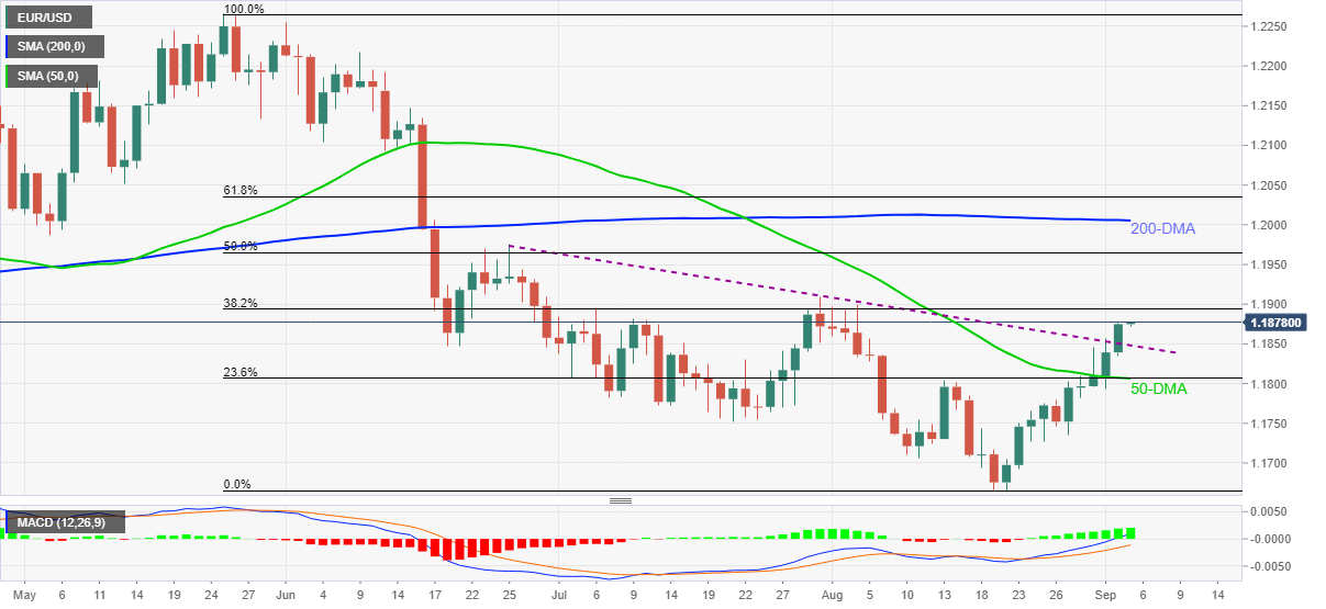 EUR/USD stays firmer for the sixth consecutive day while rising to the fresh monthly high of 1.1878 during Friday’s Asian session.