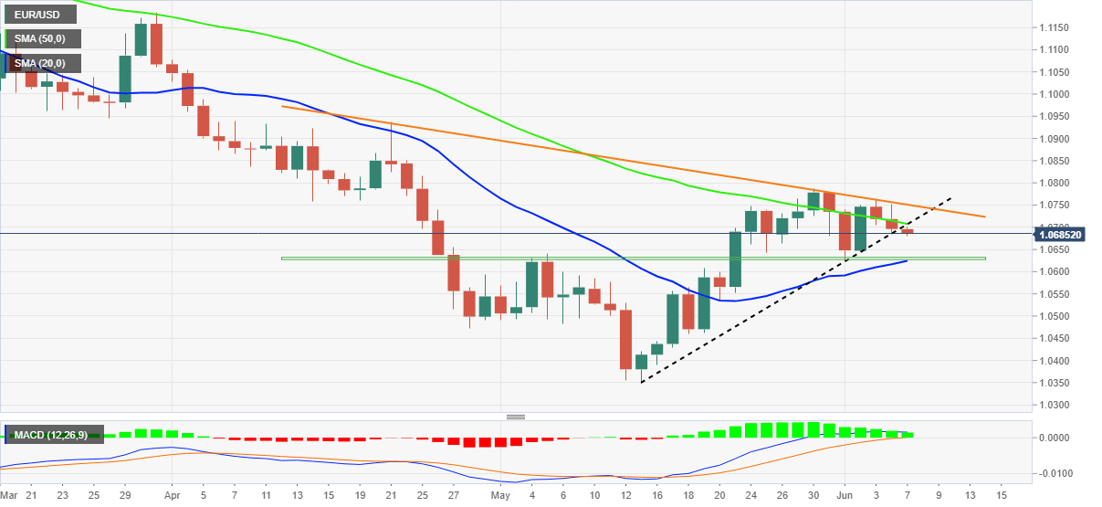 A downward sloping resistance line from late April joins the pair’s repeated failure to cross the 50-DMA to favor the EUR/USD bears. Also keeping the sellers hopeful is the recent break of an upward sloping support line from May 13, now resistance near 1.0710. Furthermore, the receding size of the bullish bars on the MACD histogram adds strength to the bearish bias.