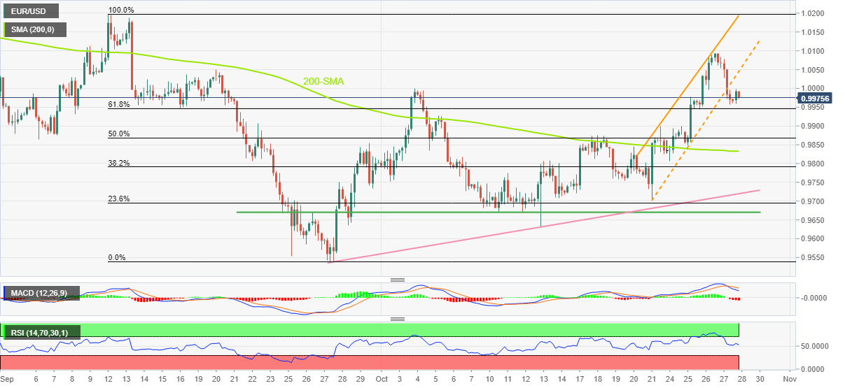 It’s worth noting that the bearish MACD and mostly steady RSI (14) keep the sellers hopeful of breaking the immediate Fibonacci retracement level, also known as the golden ratio near 0.9950, which in turn could direct prices towards the 50% Fibonacci retracement level of 0.9870. However, the 200-SMA level surrounding 0.9830 could challenge the EUR/USD bears afterward.
