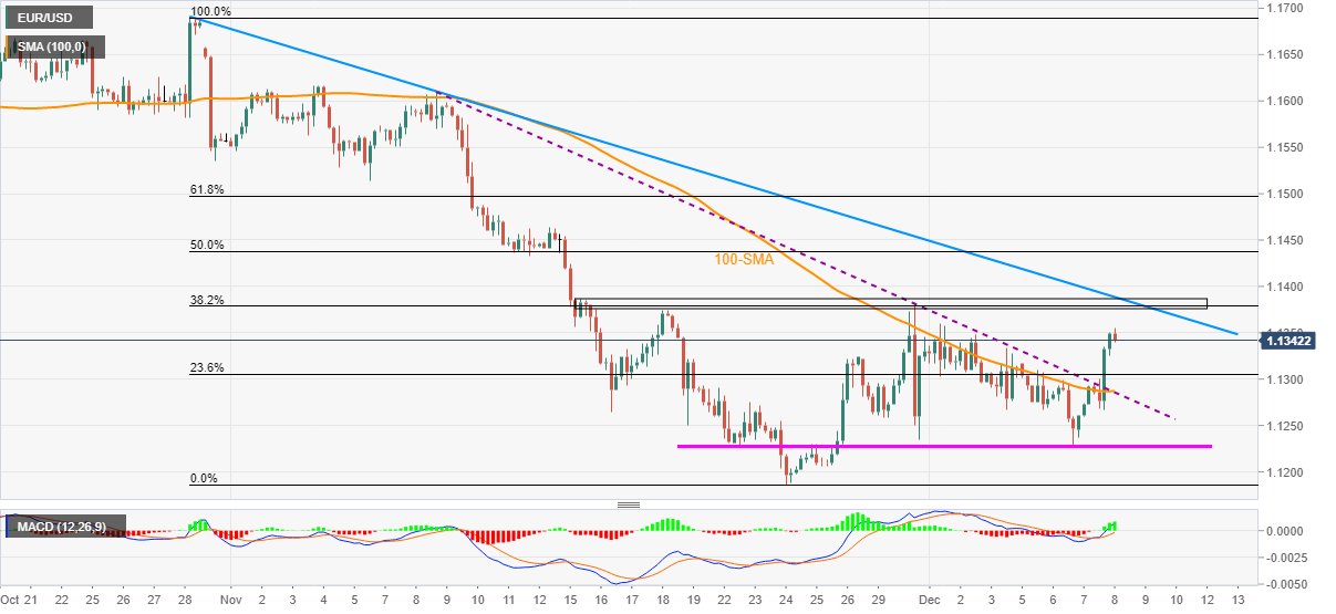 The major currency pair’s latest run-up could be linked to a successful break of the 100-SMA and a downward sloping trend line from early November, around 1.1285-90, amid bullish MACD.