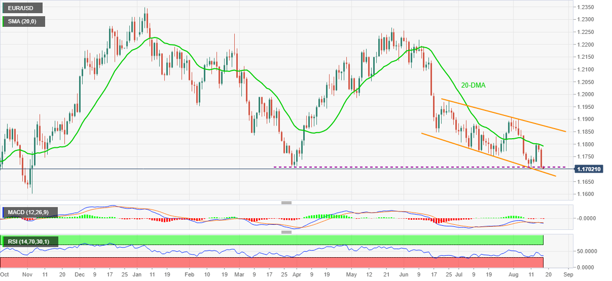 Although the major currency pair’s sustained trading below 20-DMA joins sluggish MACD and RSI line to favor sellers, the lower line of the descending trend channel extended from late June, around 1.1685 tests the further declines.