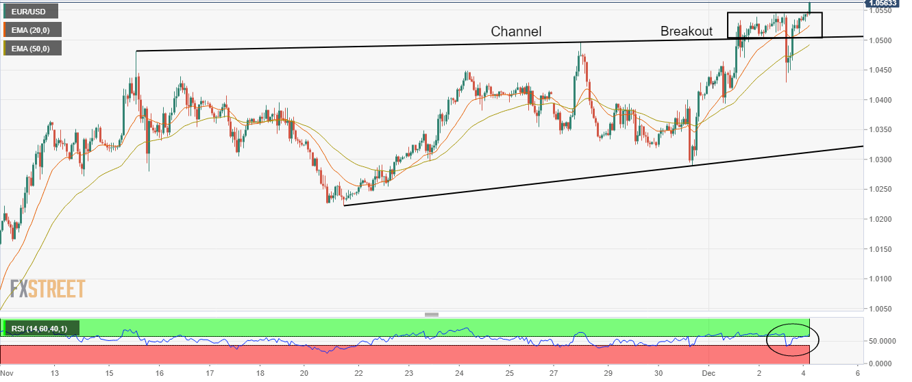 The EUR/USD pair has shifted its business above the psychological resistance of 1.0500 after a breakout of the neutral channel formation on an hourly scale. The breakout of the aforementioned chart pattern indicates more upside ahead.
