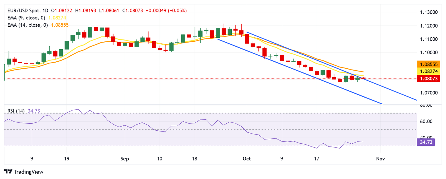 EUR/USD retraces its recent gains from the previous session, trading around 1.0810 during the Asian hours on Tuesday. A review of the daily chart shows that the pair tests the upper boundary to return to the descending channel pattern. which could reinforce a bearish bias for the pair.