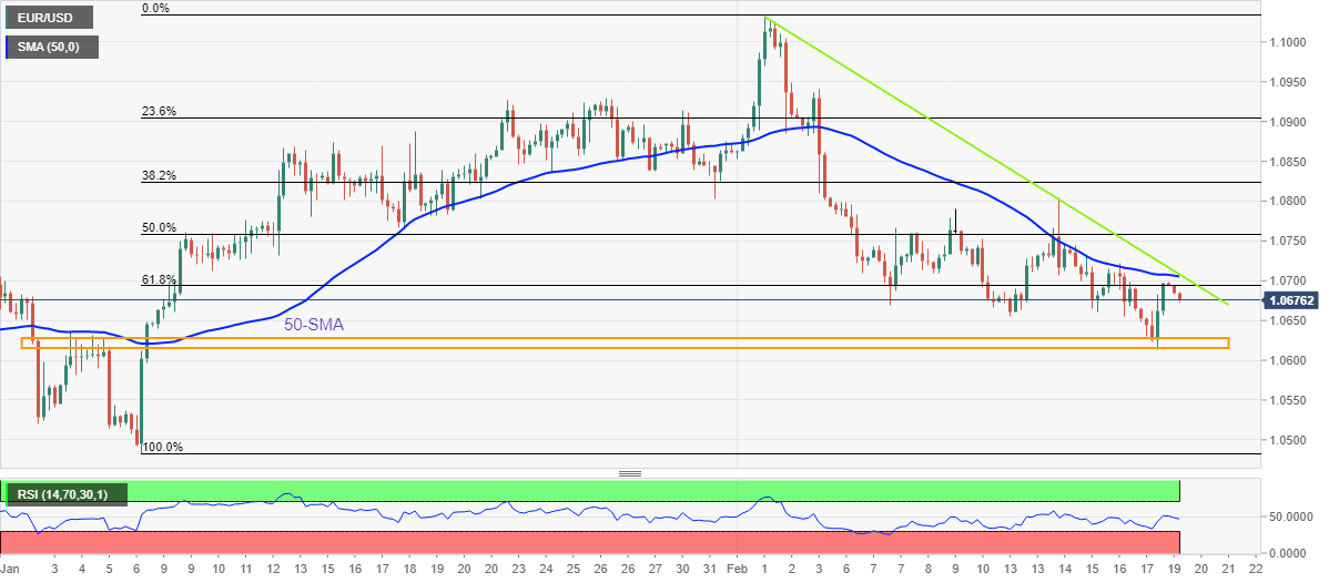 However, major attention will be given to a convergence of the 50-SMA and a downward-sloping resistance line from February 01, close to 1.0705-10.