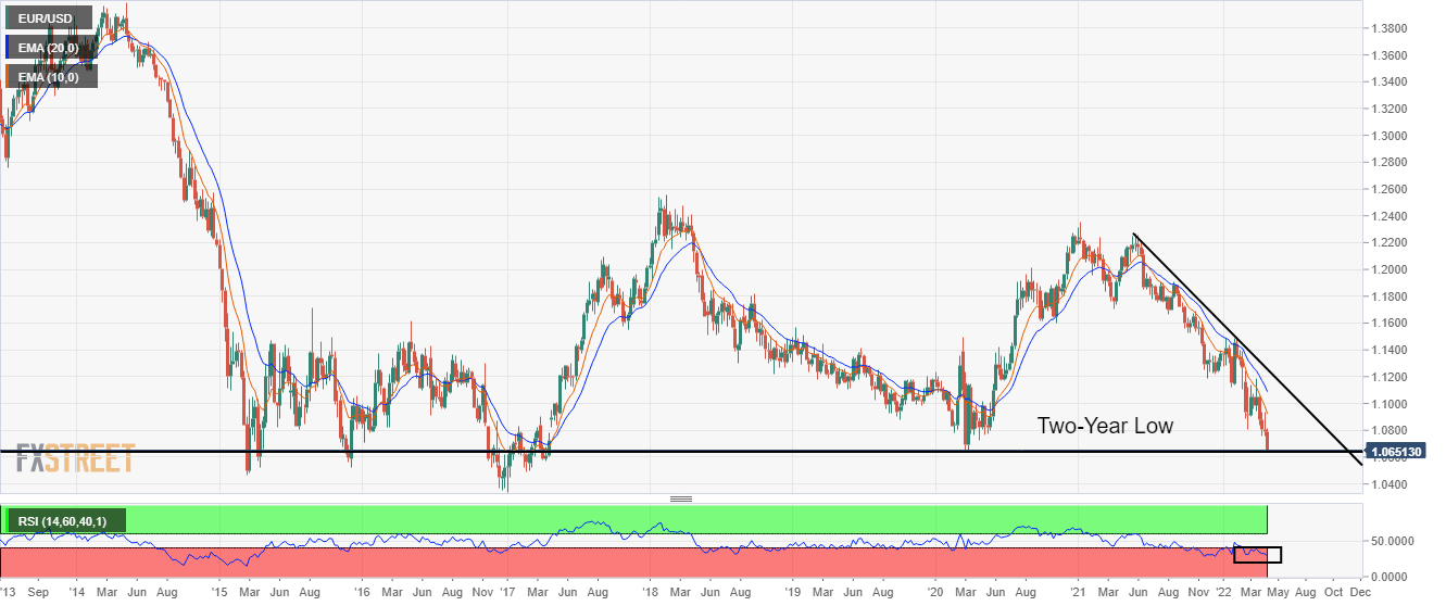 The EUR/USD pair is drifting lower firmly from the last four trading sessions after failing to sustain above the psychological resistance of 1.0900. The downside momentum has pushed the asset below 1.0700 and has registered a fresh two-year low at 1.0633 in the Asian session.