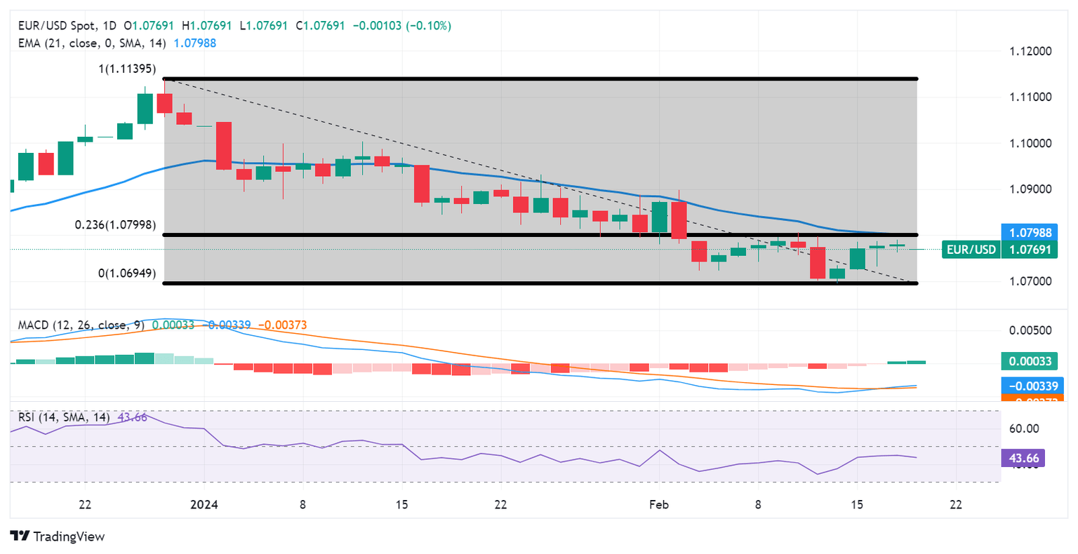 The EUR/USD pair could find the key resistance zone around the 21-day Exponential Moving Average (EMA) at 1.0798 lined up with the 23.6% Fibonacci retracement at 1.0799 and the psychological level of 1.0800.