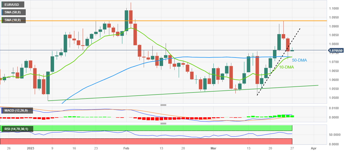However, a convergence of the 50-DMA and the 10-DMA, around 1.0730, appears a tough nut to crack for the EUR/USD bears, especially amid bullish MACD signals.