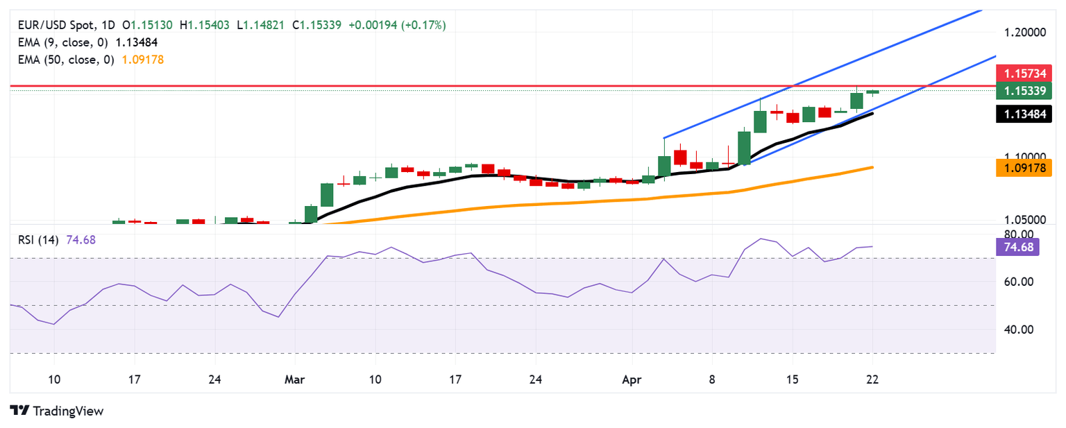 EUR/USD extends its gains for the third successive session, trading around 1.1530 during the Asian hours on Tuesday. The technical analysis of the daily chart suggests growing buying pressure and as the pair is moving upwards within an ascending channel pattern.
