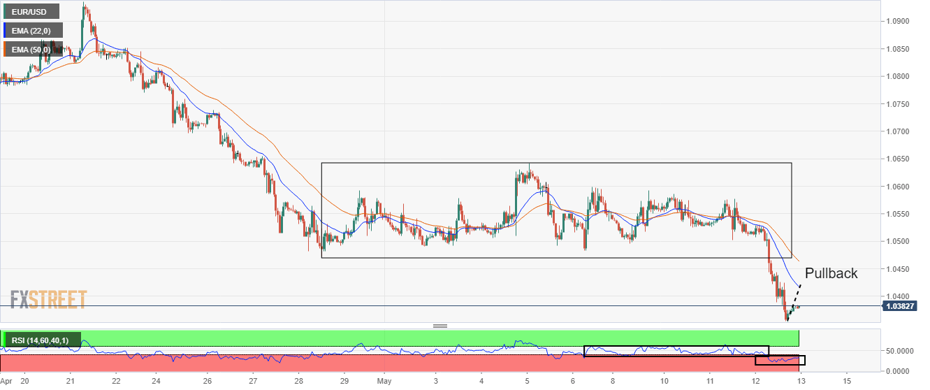 On the hourly scale, the shared currency bulls have been through an extreme sell-off after breaking below May’s range of 1.0471-1.0642. This will be followed by a minor bullish pullback to near the 20-period Exponential Moving Average (EMA) at 1.0418 as initiative sellers will kick in. The 50-EMA at 1.0460 is declining sharply, which adds to the downside filters.