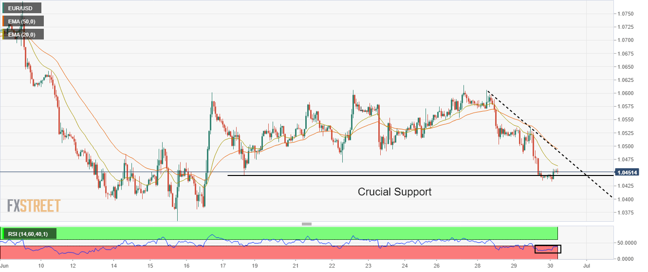 The shared currency bulls are attempting to defend the two-week-old crucial support of 1.0444, recorded on June 17. The trendline placed from Tuesday’s high at 1.0606 will act as a major resistance for the eurozone bulls.