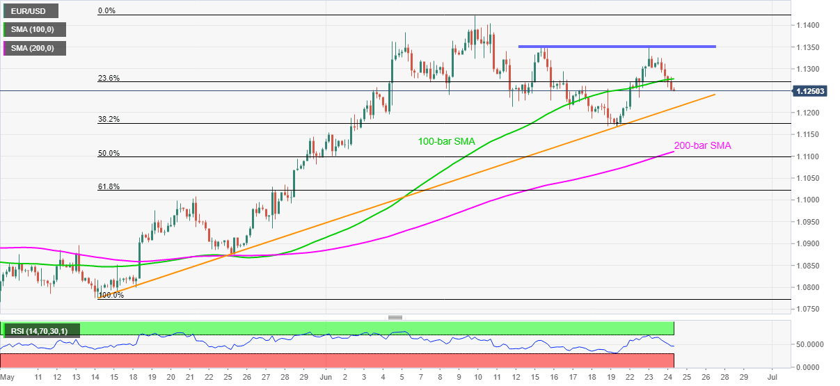 EUR/USD refreshes the intraday low near 1.1250 during the initial Asian session on Thursday. The pair recently accelerated downside moves after breaking 100-bar SMA. The same follows the quote’s U-turn from June 16 top on Tuesday.