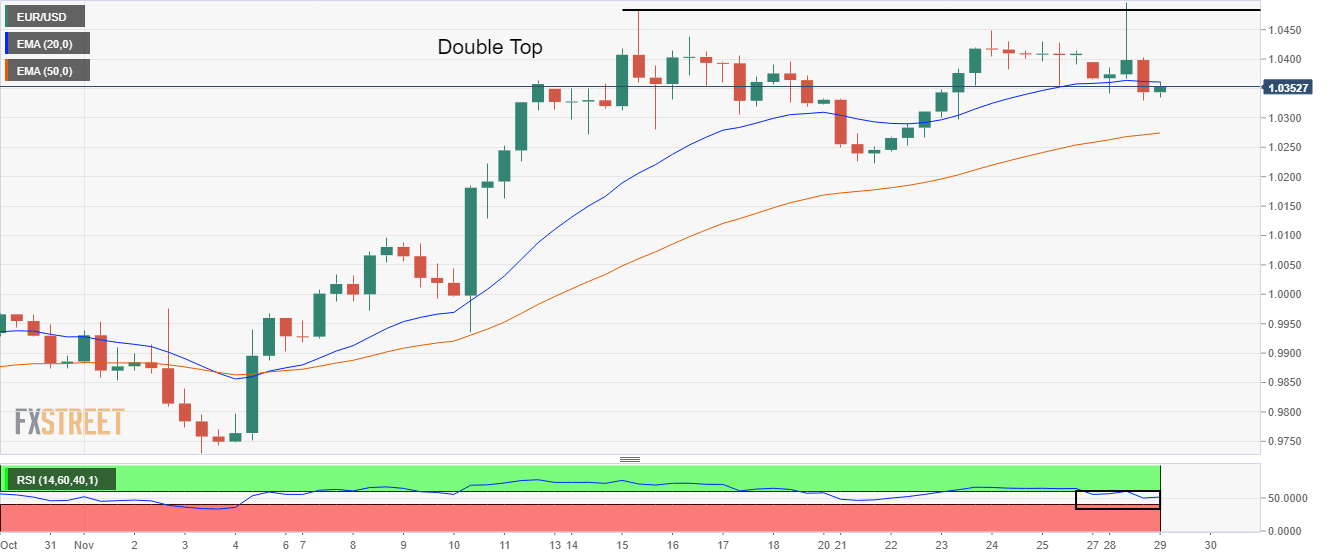 - A Double Top formation around 1.0500 has triggered a bearish reversal for the major currency pair.