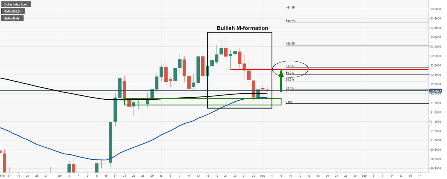 The DXY index is also constructively bullish with the convergence of the 50 and 200-day EMAs at an area of support within a bullish M-formation pattern.