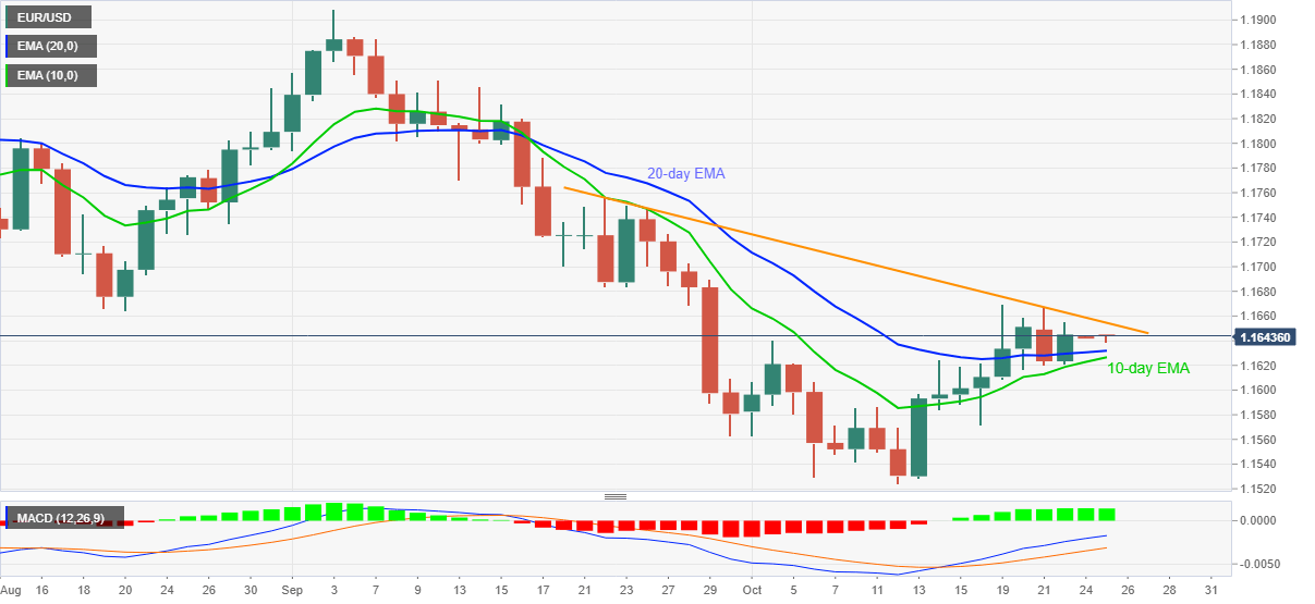 In doing so, the currency major pair stays firmer above 10-day and 21-day EMAs amid bullish MACD signals, suggesting further advances towards the downward sloping resistance line from September 22, near 1.1655.