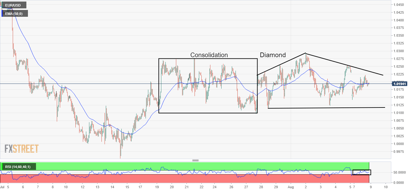 The 50-period Exponential Moving Average (EMA) at 1.0193 is overlapping with the asset prices, which signals a consolidation ahead.