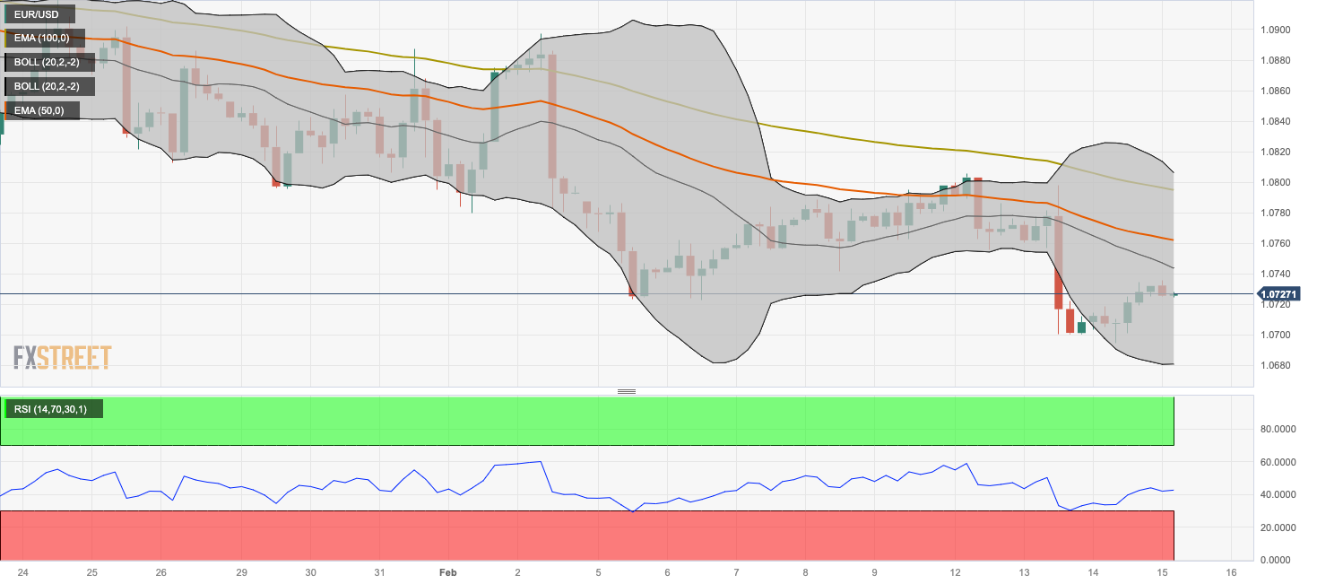 The EUR/USD pair remains on the defensive above the 1.0700 mark during the early European trading hours on Thursday. The Eurozone Gross Domestic Product (GDP) for the fourth quarter remained flat in the final quarter of 2023, in line with the flash reading. However, incoming data continues to signal weakness in the near term, which drags the Euro (EUR) lower against the US Dollar (USD). At press time, EUR/USD is trading at 1.0727, losing 0.01% on the day.