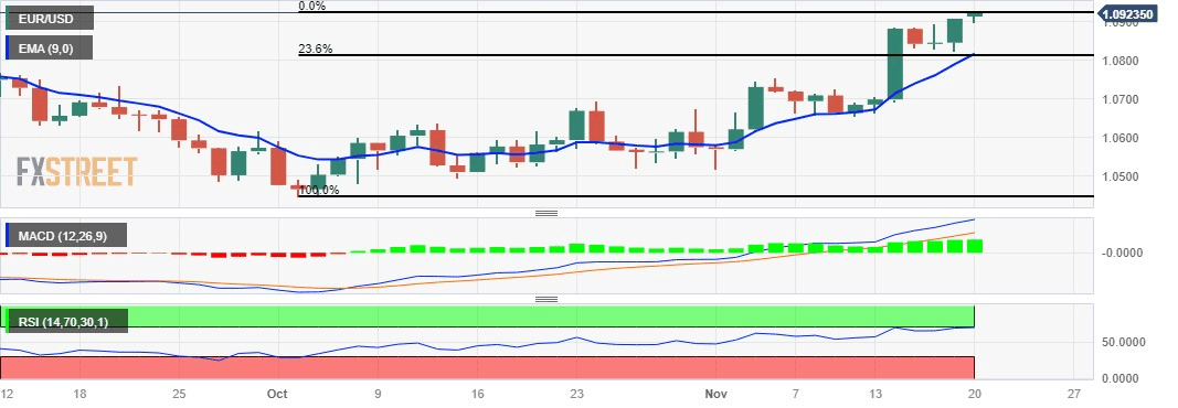EUR/USD continues the winning streak, trading around a three-month high at 1.0920 during the Asian session on Monday. The pair seems to approach immediate resistance around the major level at 1.0950 as the US Dollar (USD) faces pressure on the likelihood of the Federal Reserve (Fed) to conclude its interest rate-hike cycle.