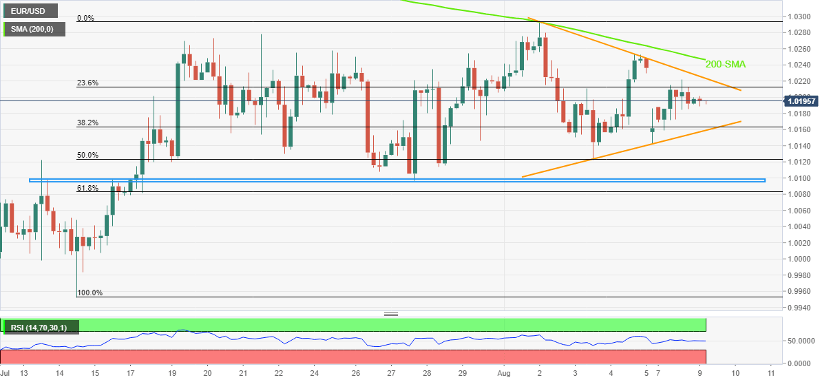 EUR/USD Price Analysis: Treads water around 1.0200 inside weekly triangle