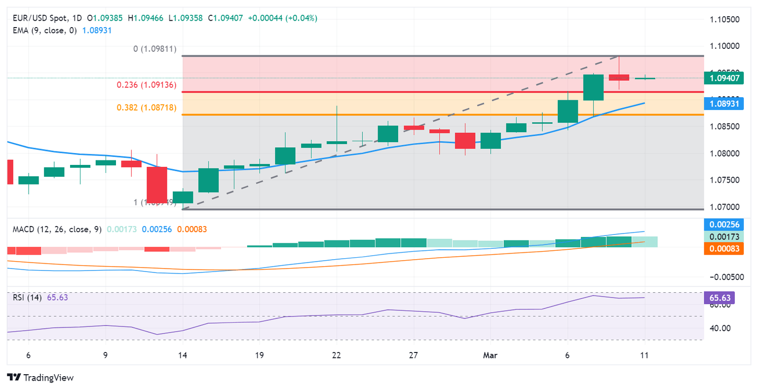 EUR/USD exhibits sideways movement amid a stable US Dollar (USD) following the upbeat US Nonfarm Payrolls released on Friday. The pair hovers around 1.0940 during the Asian trading hours on Monday, with an immediate resistance barrier at 1.0950 level followed by the eight-week high of 1.0981, marked in the previous session.