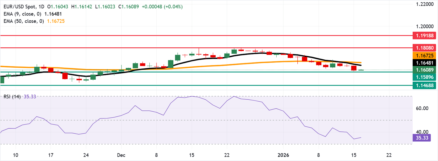 EUR/USD holds ground after three days of losses, trading around 1.1610 during the Asian hours on Friday. The 14-day Relative Strength Index (RSI) momentum indicator, currently at 35 (neutral-bearish), shows momentum skewed to the downside.