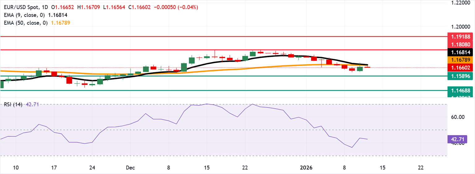 The immediate resistance lies at the 50-day EMA of 1.1679, aligned with the nine-day EMA at 1.1681. A daily close above the averages would revive the momentum and support the EUR/USD pair to target the three-month high of 1.1808, which was recorded on December 24, followed by the 1.1918, the highest level since June 2021.