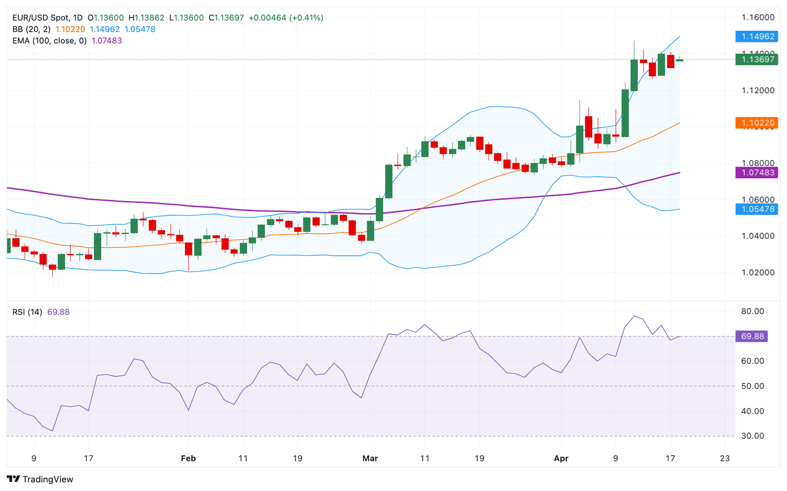 The EUR/USD pair strengthens to around 1.1370 during the early European trading hours on Friday. Hopes for a trade deal between the United States (US) and the European Union (EU) provide some support to the Euro (EUR). Trading volume is likely to be lightened on Good Friday.