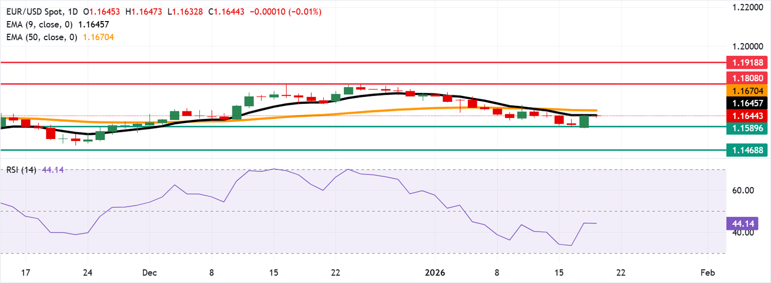EUR/USD moves little after registering modest gains in the previous session, trading around 1.1640 during the Asian hours on Tuesday. The 14-day Relative Strength Index (RSI) momentum indicator, at 44 (neutral-to-bearish), confirms fading momentum.