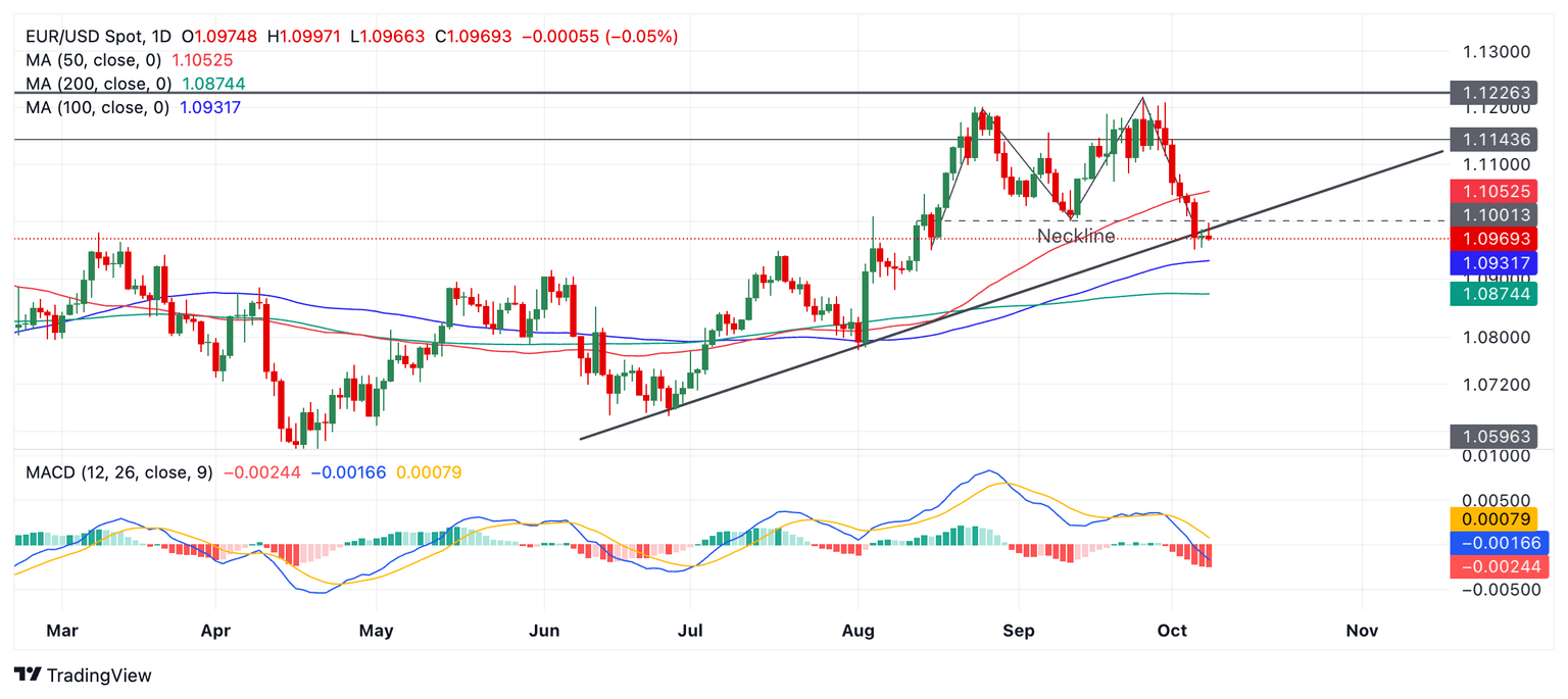 A confirmed break of the trendline would likely lead to a deeper sell-off. Such a move might reach a target at 1.0865 initially (the 61.8% Fibonacci (Fib) extrapolation of the move prior to the trendline break). The 200-day Simple Moving Average (SMA), however, could come in with support a little before then at 1.0875, suggesting another more conservative option.