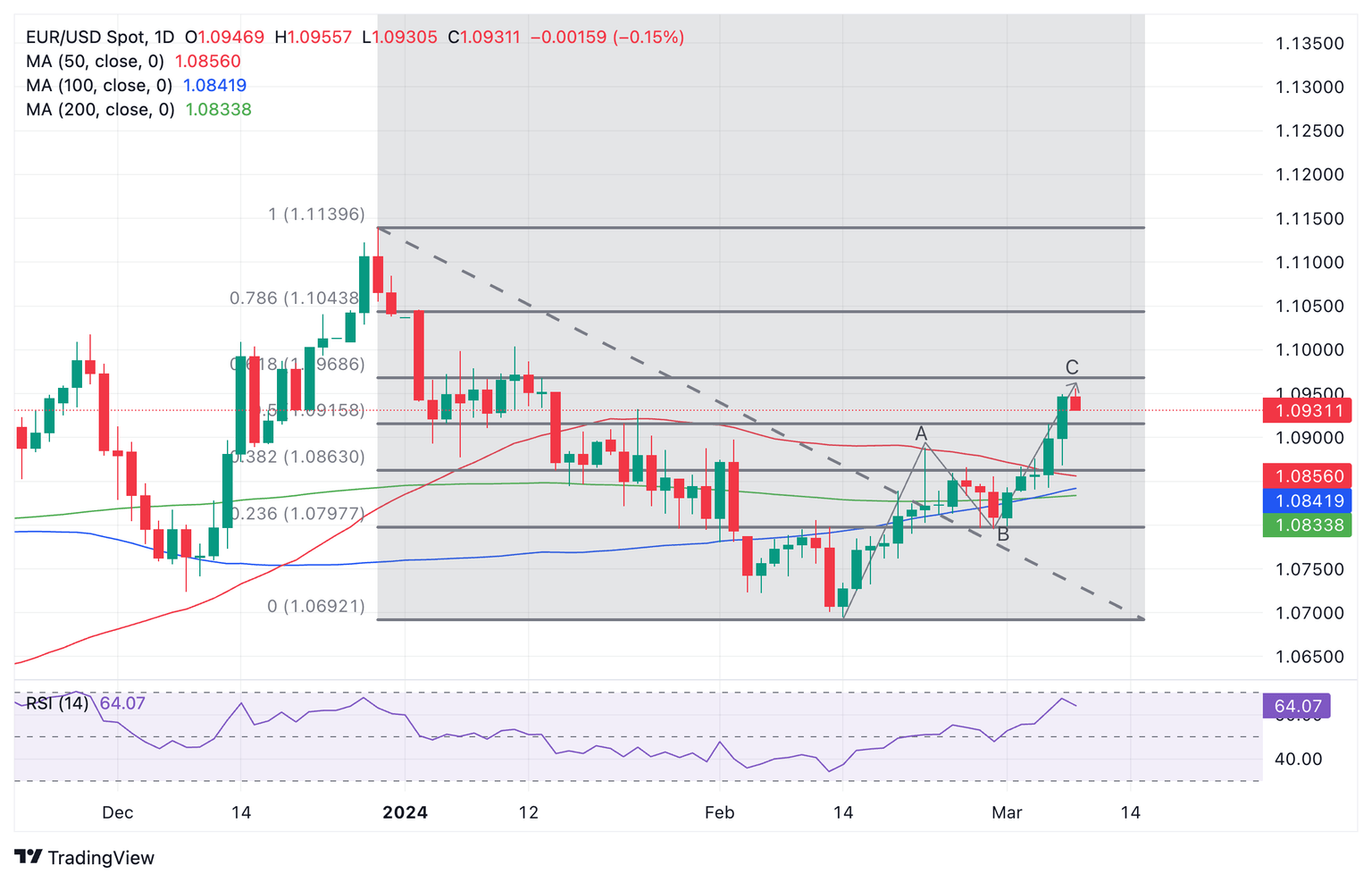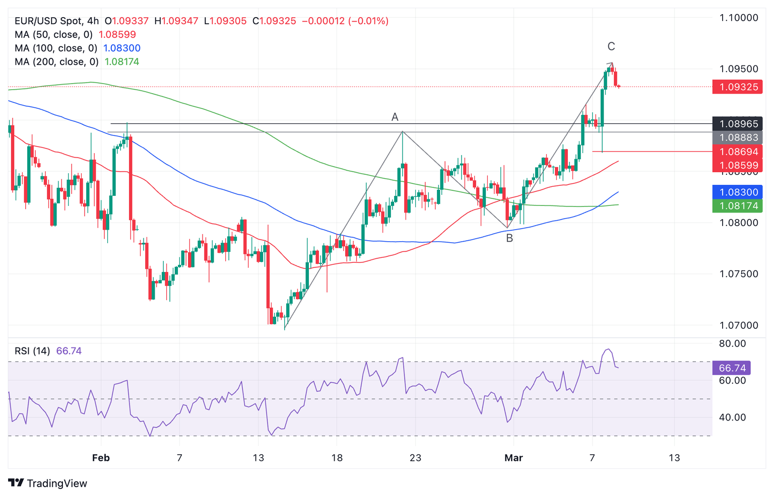EUR/USD rises up to touch the highs of the day in the 1.0970s on Friday after the release of US Nonfarm Payrolls shows disinflationary wage data and a suprise rise in the Unemployment Rate in February.