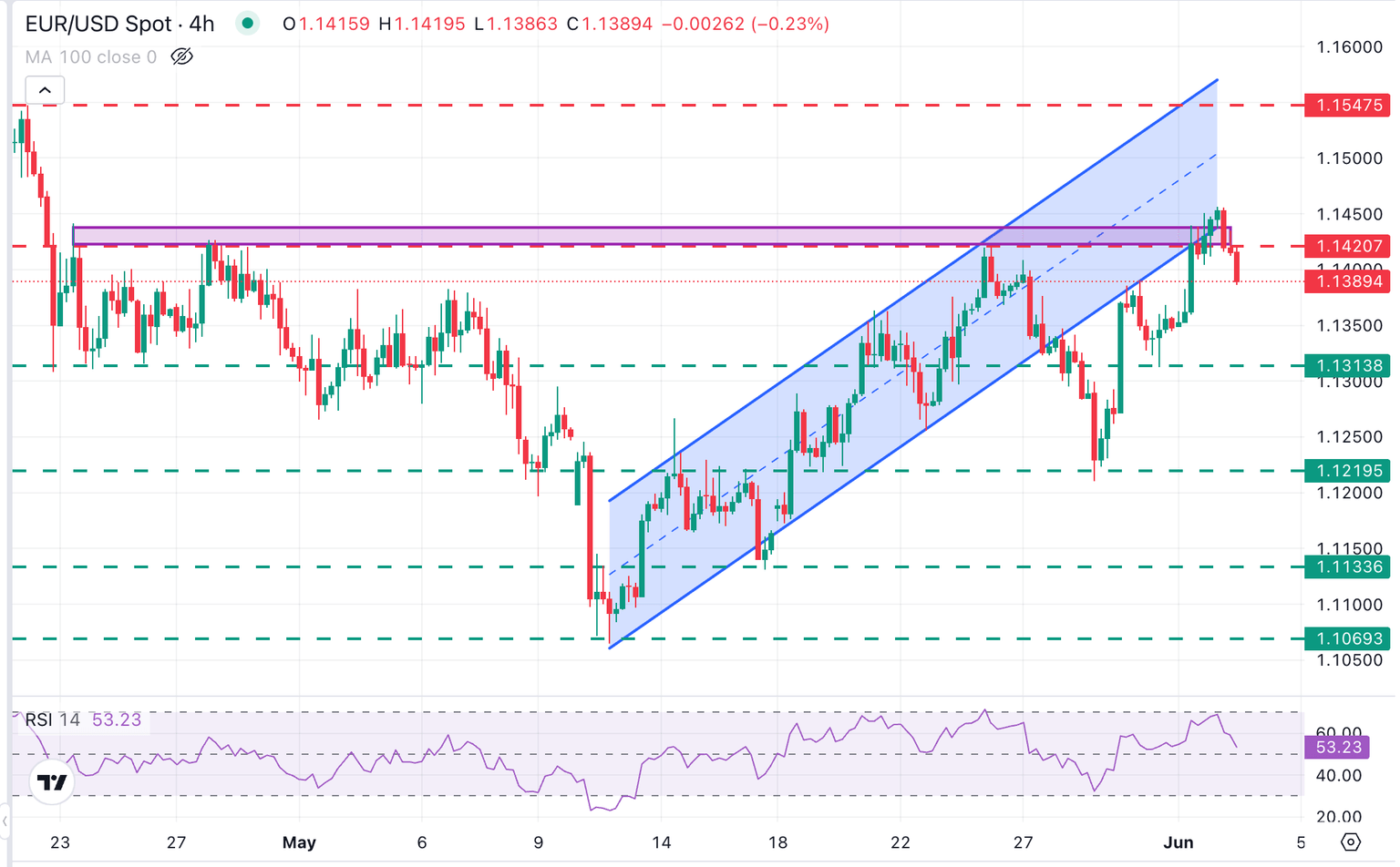 EUR/USD hit six-week highs at 1.1450 on Monday but failed to consolidate above the resistance area between 1.1415 and 1.1435, which has been holding bulls since mid-April.
