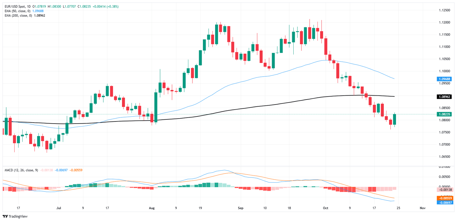 EUR/USD made a half-hearted recovery on Thursday, rebounding four-tenths of one percent and clawing back north of the 1.0800 handle. Despite a late-week bounce, Fiber remains steeply off of recent highs after declining over 4% top-to-bottom from late September’s peak bids near 1.1200.