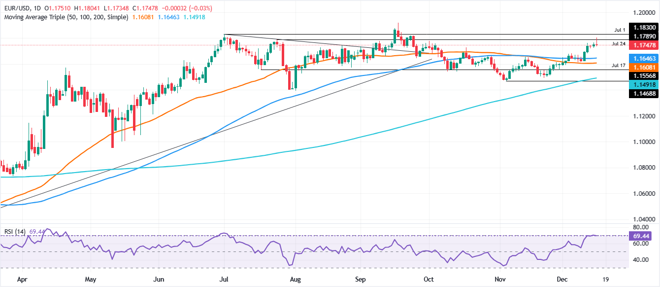 EUR/USD holds firm at around 1.1750, virtually flat after the latest US jobs report reinforced the chances that the Federal Reserve (Fed) could continue its easing cycle into next year. At the time of writing, the pair posted minuscule losses of 0.04%.