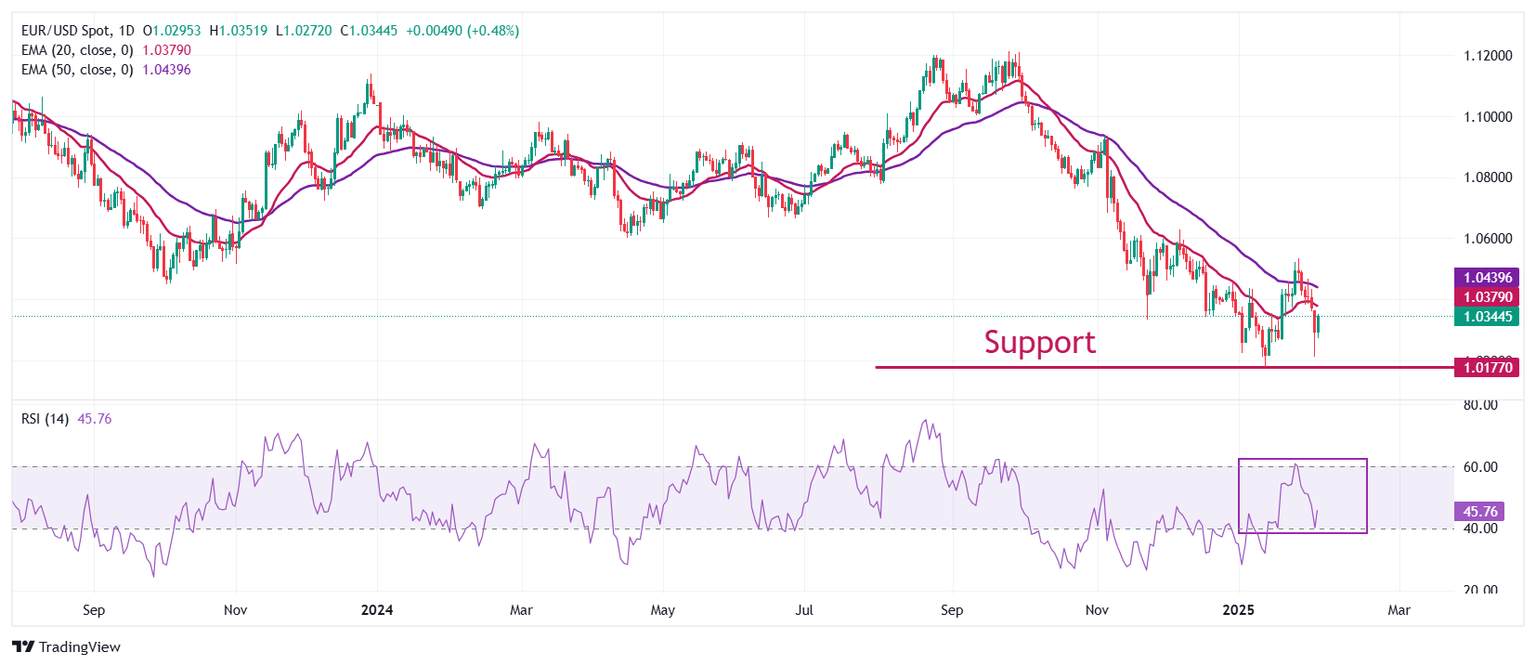 - EUR/USD rebounds sharply to near 1.0350 as US President Trump postpones his orders of tariffs on Canada and Mexico for 30 days.