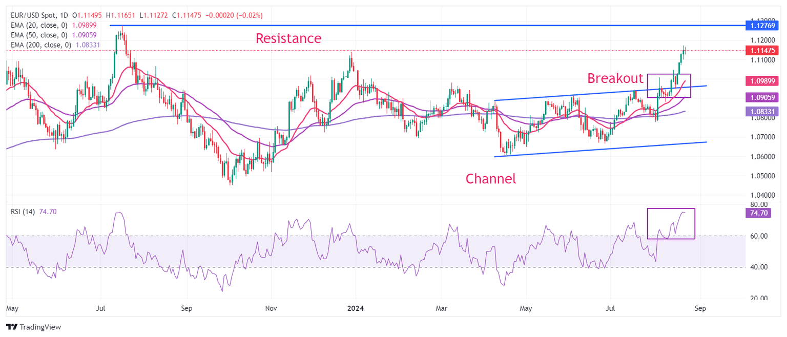 EUR/USD declines sharply to near the round-level support of 1.1100 in Thursday’s early North American session from a fresh year-to-date high of 1.1175 posted on Wednesday. The major currency pair weakens as the US Dollar (USD) bounces back from a fresh 2024 low. The US Dollar Index (DXY), which tracks the Greenback’s value against six major currencies, jumps to near 101.50 after the release of the better-than-estimated flash United States (US) S&P Global PMI data for August.