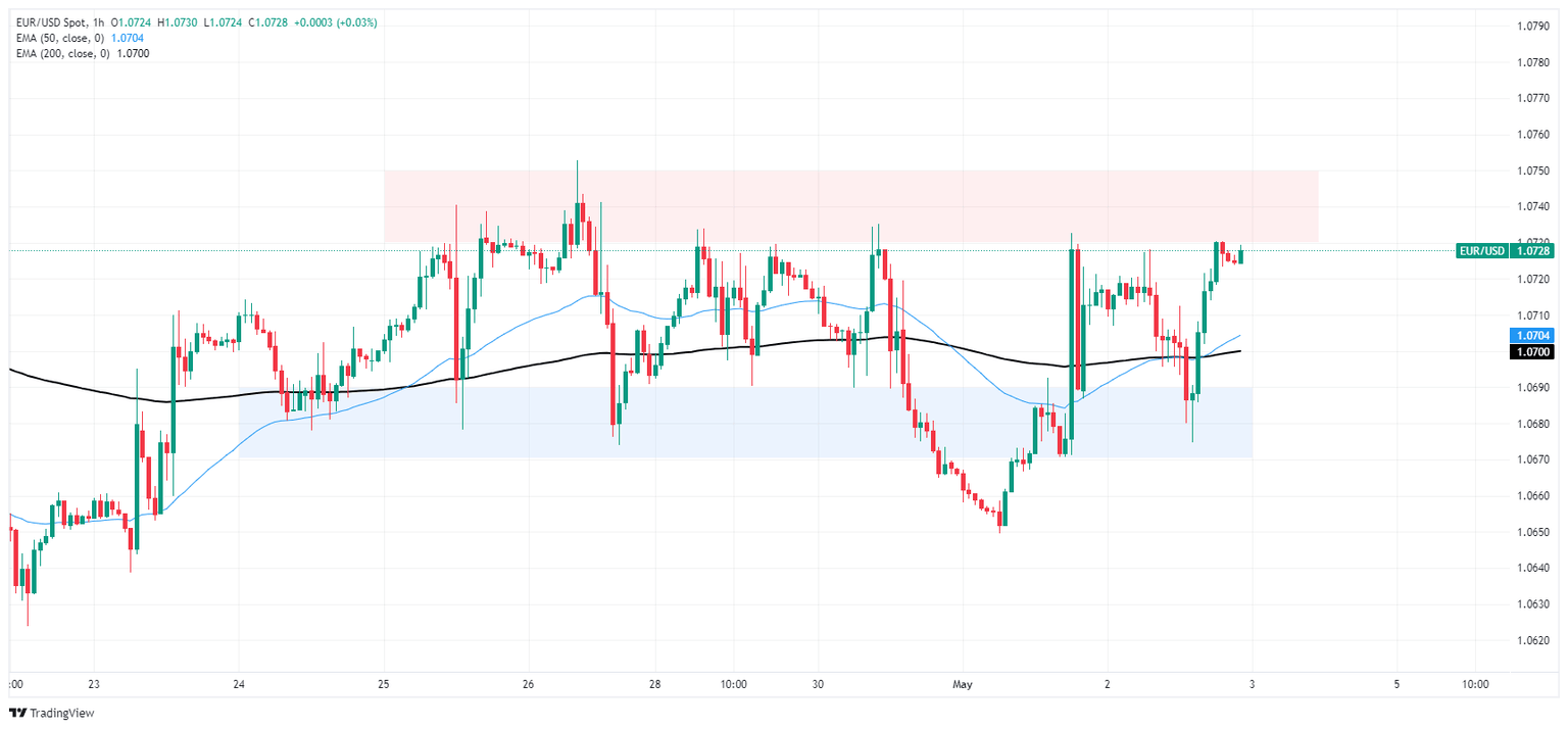 EUR/USD drove back to the top end of recent consolidation on Thursday, recovering chart territory north of the 1.0700 handle as market risk appetite regains balance heading into another US Nonfarm Payrolls (NFP) Friday.