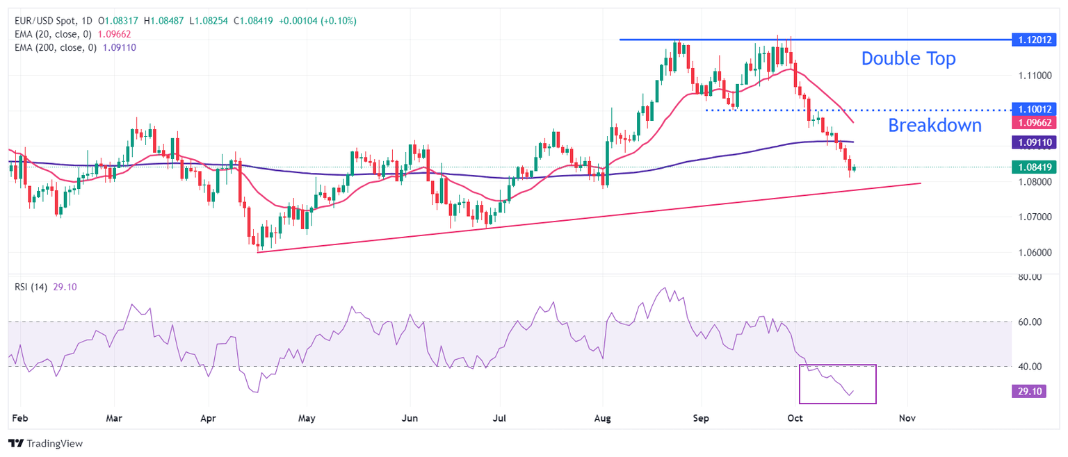 EUR/USD endeavors to hold the immediate support of 1.0800 in European trading hours. The major currency pair extended its downfall after breaking below the 200-day Exponential Moving Average (EMA), which trades around 1.0910, earlier this week.