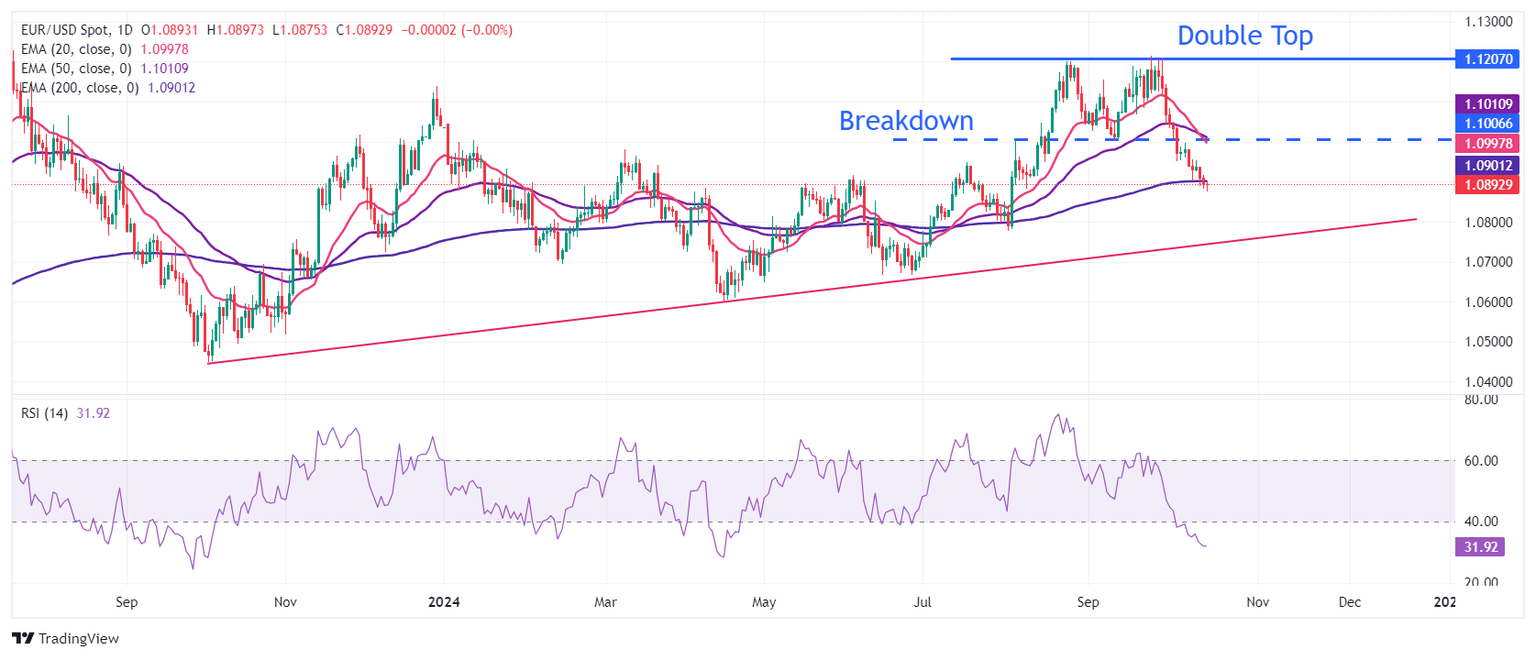 EUR/USD trades cautiously below the key resistance of 1.0900 in the North American trading hours. The major currency pair weakened after a breakdown of the Double Top formation on a daily timeframe on October 4, which resulted in a bearish reversal.