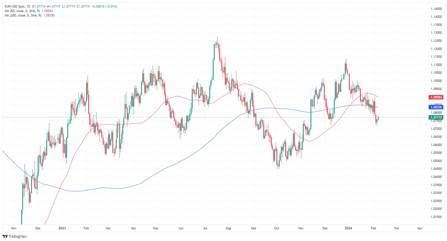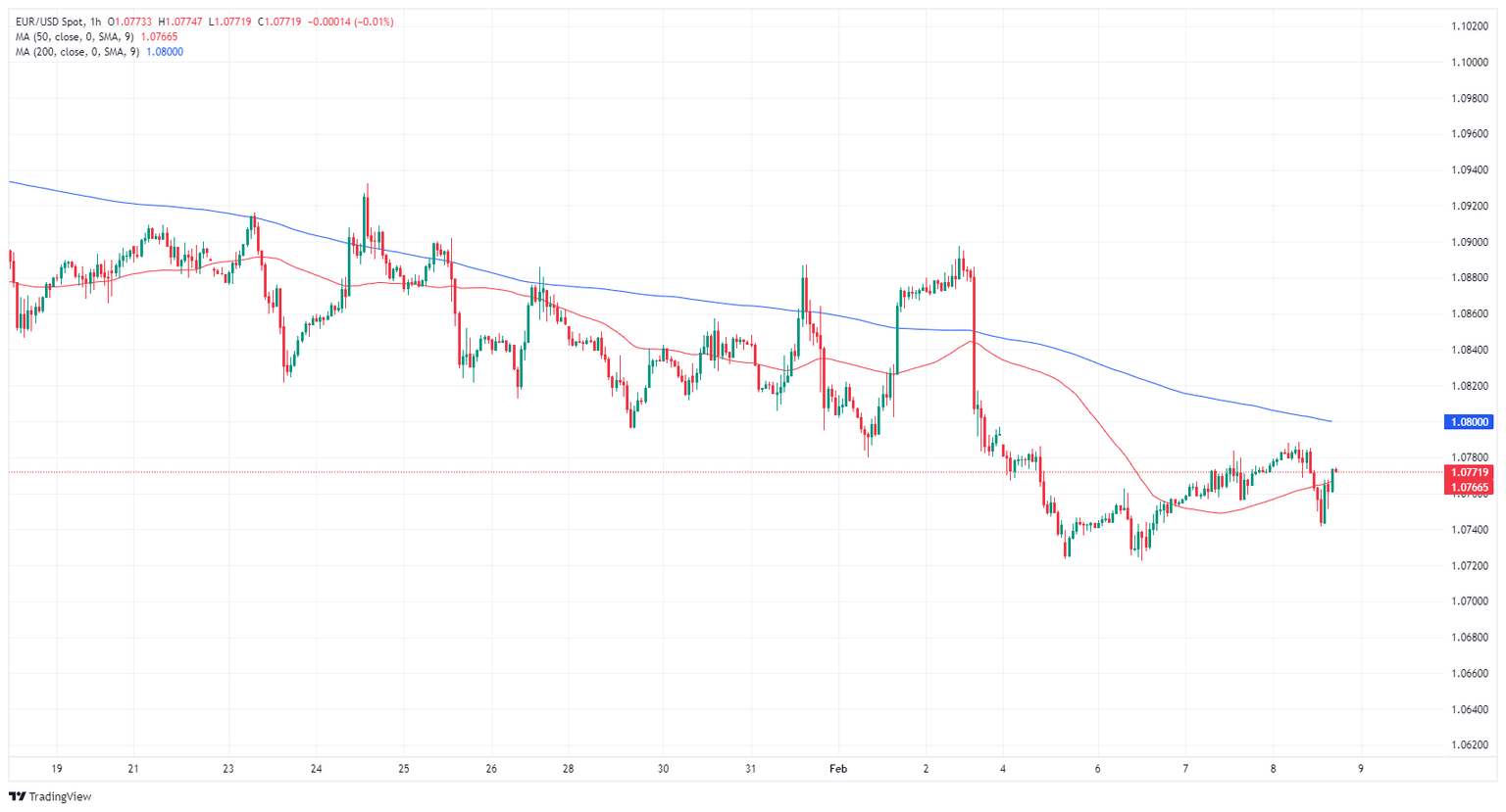 EUR/USD dipped on Thursday, falling toward 1.0740 before seeing a brief pullback in the US market session, but the pair remains hamstrung below the 200-hour Simple Moving Average (SMA) at 1.0800.