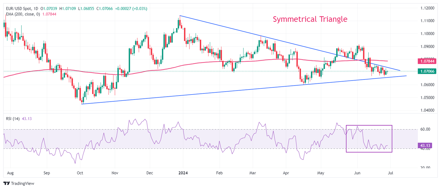 - EUR/USD holds ground near 1.0700 as the US Dollar corrects. The Euro’s outlook appears to be uncertain ahead of the French elections outcome and the Eurozone preliminary Harmonized Index of Consumer Prices (HICP) data for June, which will be published on Tuesday.