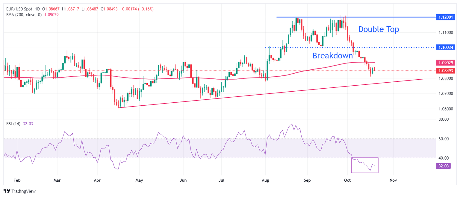 EUR/USD holds the immediate support of 1.0800 in North American trading hours. However, the outlook of the major currency pair remains uncertain as it trades below the 200-day Exponential Moving Average (EMA), which trades around 1.0900.