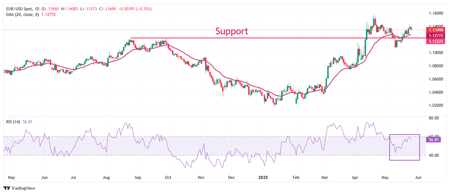 EUR/USD corrects from the month high of 1.1420, trading near 1.1350 at the time of writing on Tuesday. However, the near-term outlook of the pair remains bullish as it holds the 20-day Exponential Moving Average (EMA), which is around 1.1277.